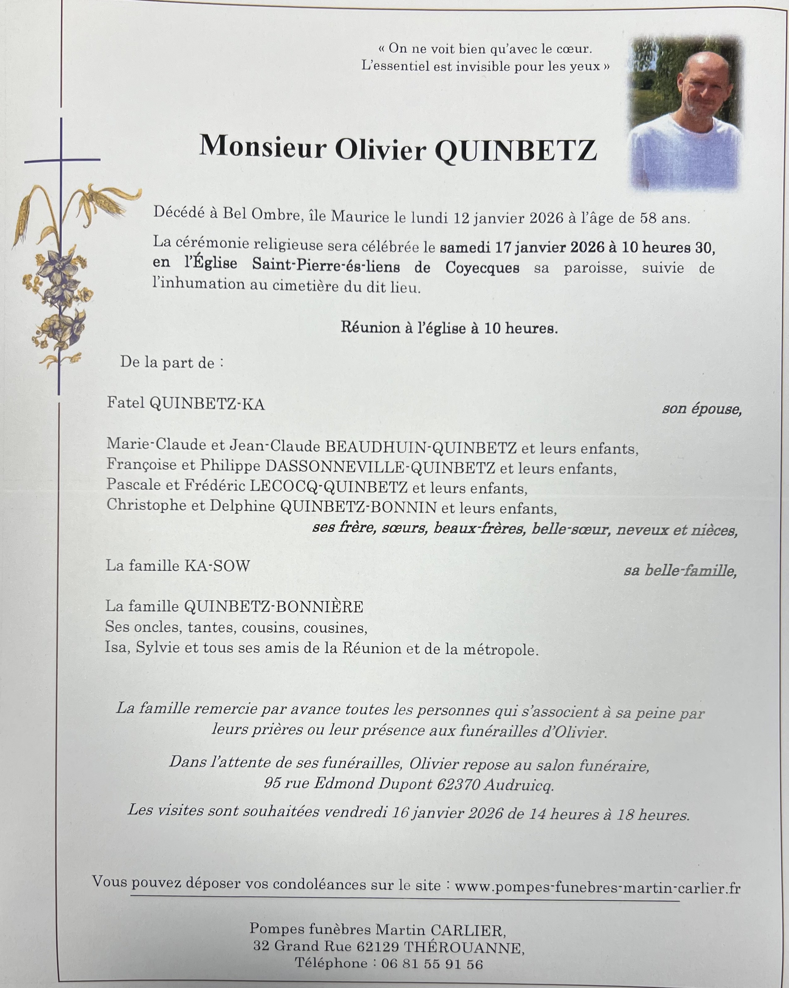 C’est avec une grande tristesse que nous vous annonçons le décès d’Olivier QUINBETZ survenu le lundi 12 janvier 2026. La cérémonie se déroulera le samedi 17 janvier 2026 à 10h30 à l’adresse suivante : Église Saint Pierre - 62560 Coyecques.