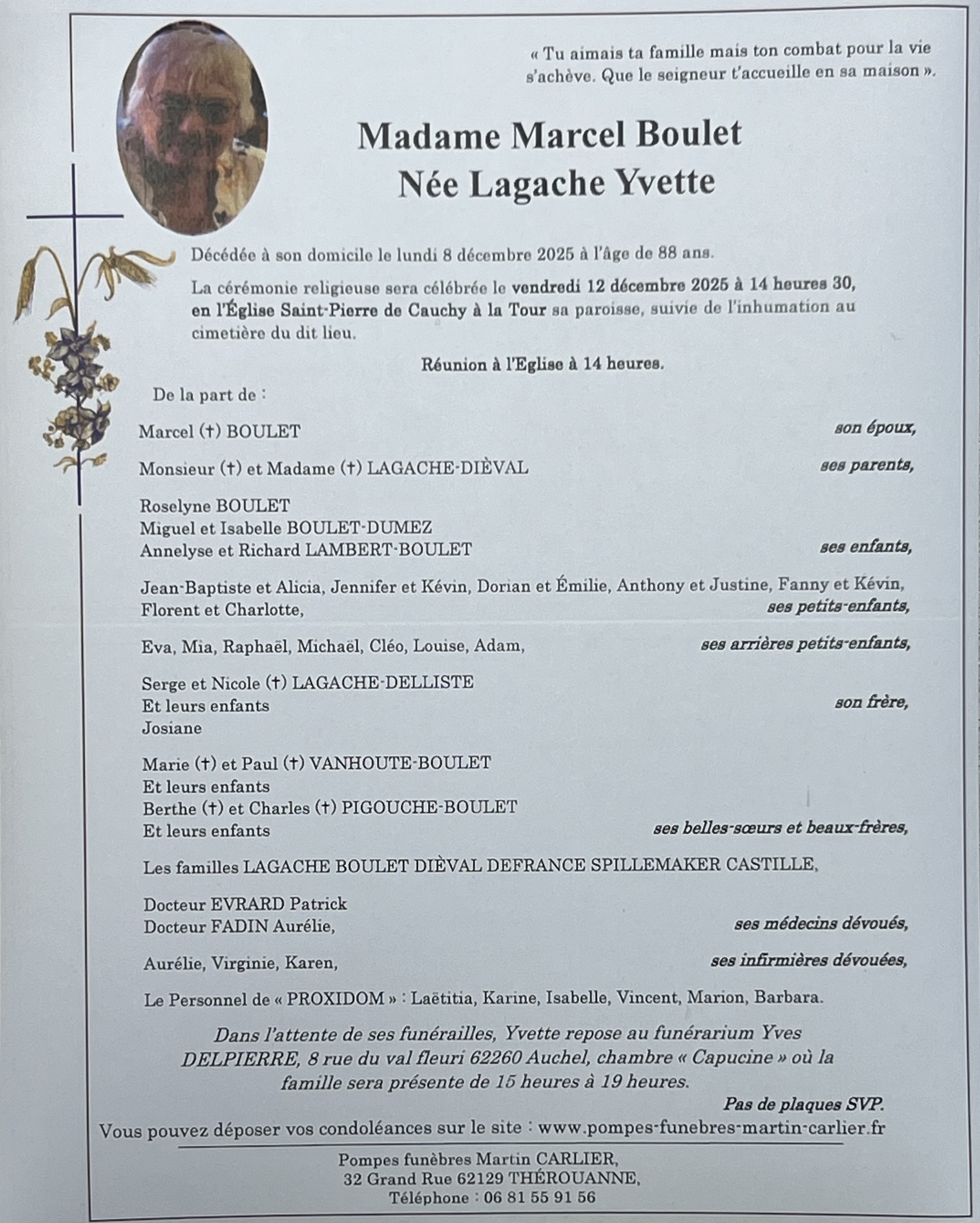 C’est avec une grande tristesse que nous vous annonçons le décès d’Yvette BOULET survenu le lundi 08 décembre 2025 à Auchel. La cérémonie se déroulera le vendredi 12 décembre 2025 à 14h30 à l’adresse suivante : Église Saint Pierre - rue de l'Église - 62260 Cauchy-À-la-Tour.